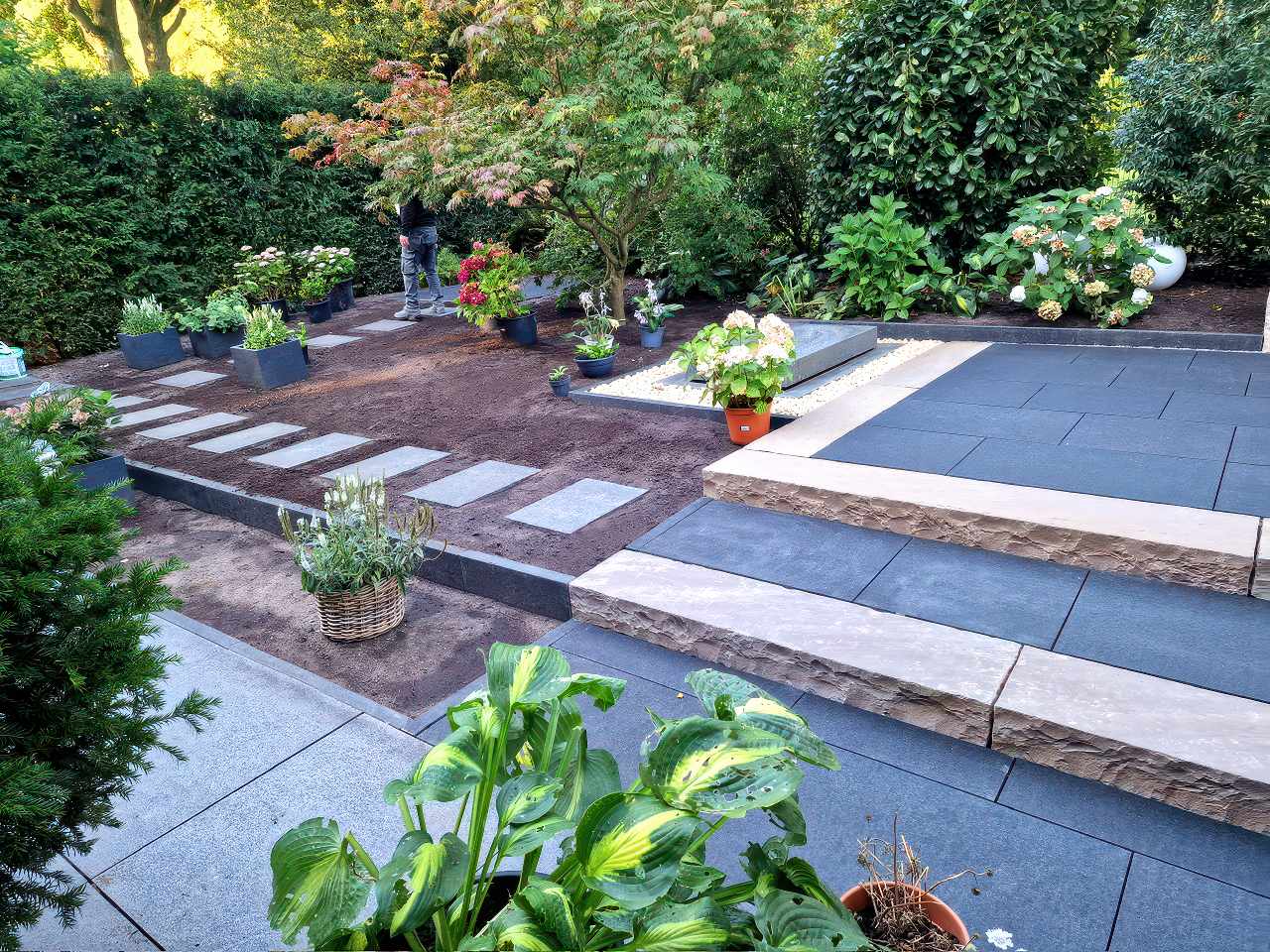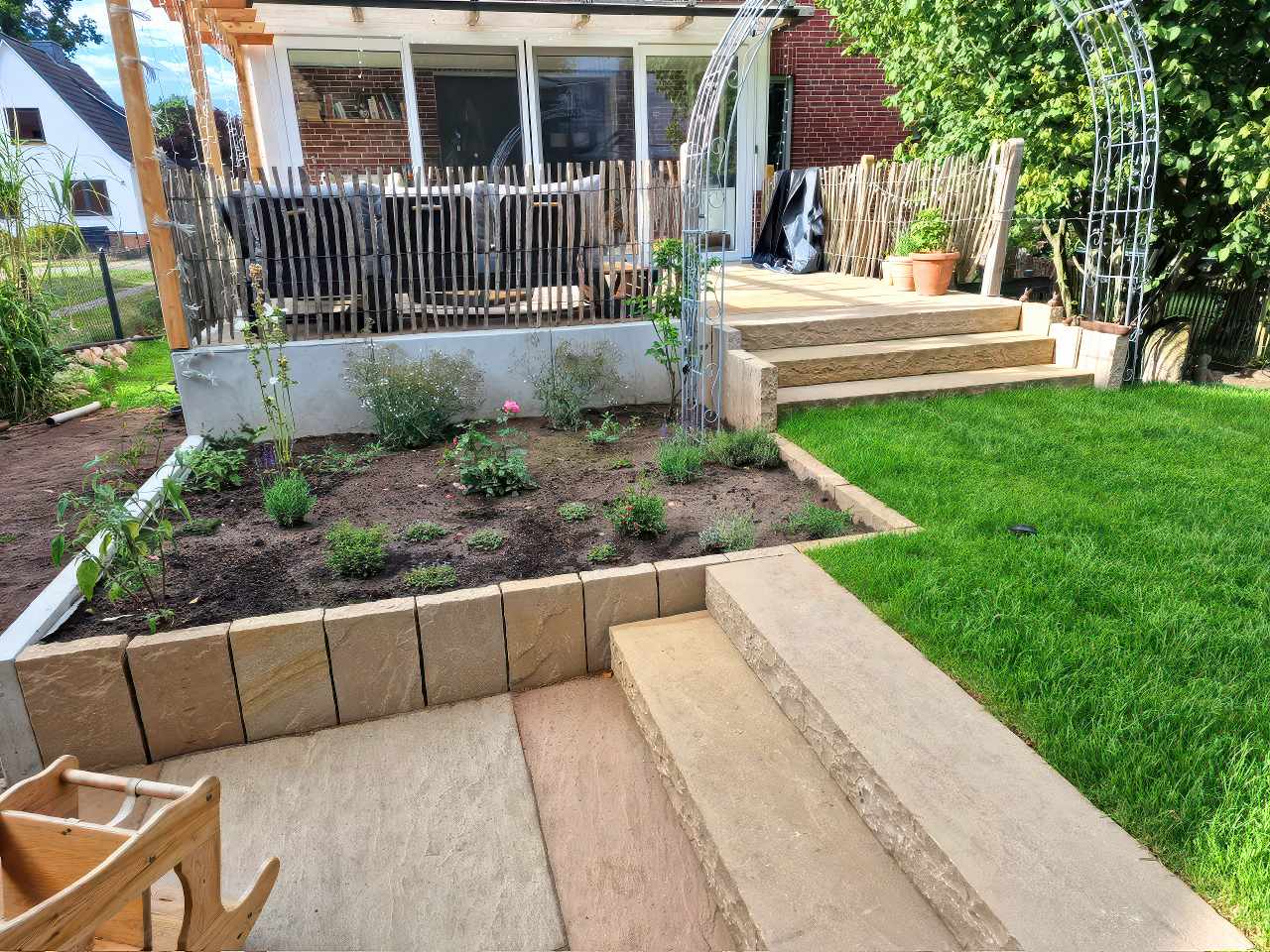 Ein Projekt aus Naturstein in Heimfeld: Die Terrasse wurde verlängert, Sandstein-Blockstufen eingebaut und eine harmonische, durchdachte Anlage geschaffen – ein Garten ohne Rasen, mal ganz anders.