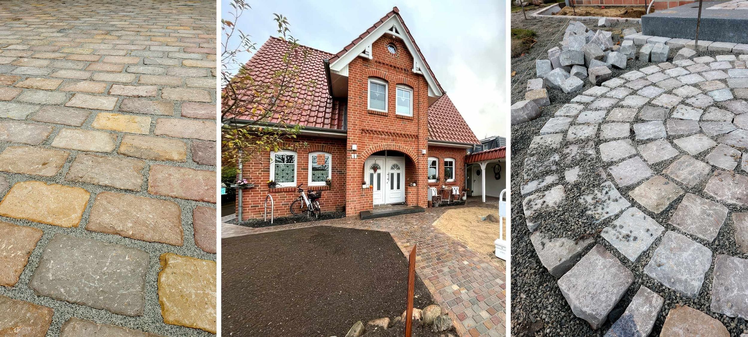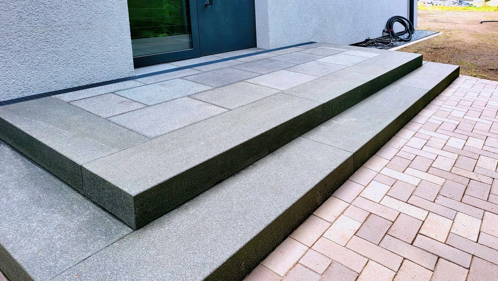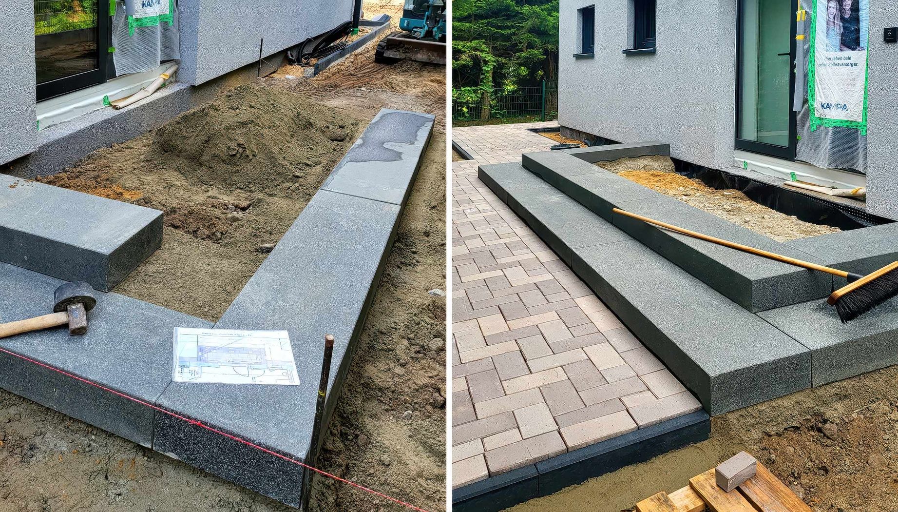 Während die Bauherren im Urlaub waren, wurde fleißig gearbeitet: In drei Wochen entstanden eine neue Zufahrt, Zuwegung und ein Podest – komplett aus Naturstein. Fugenmörtel sorgt dafür, dass Unkraut keine Chance hat.