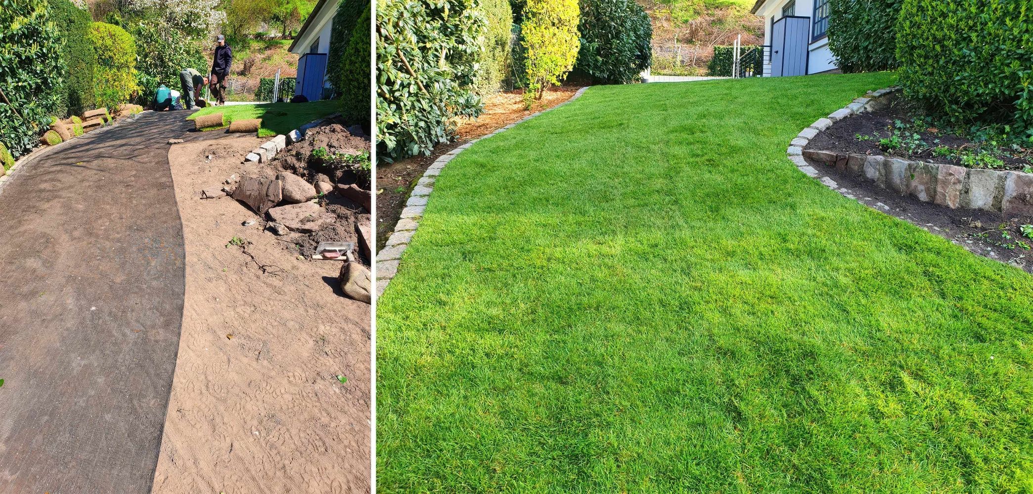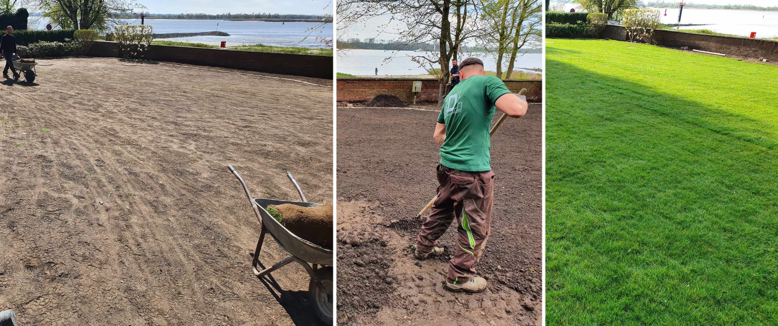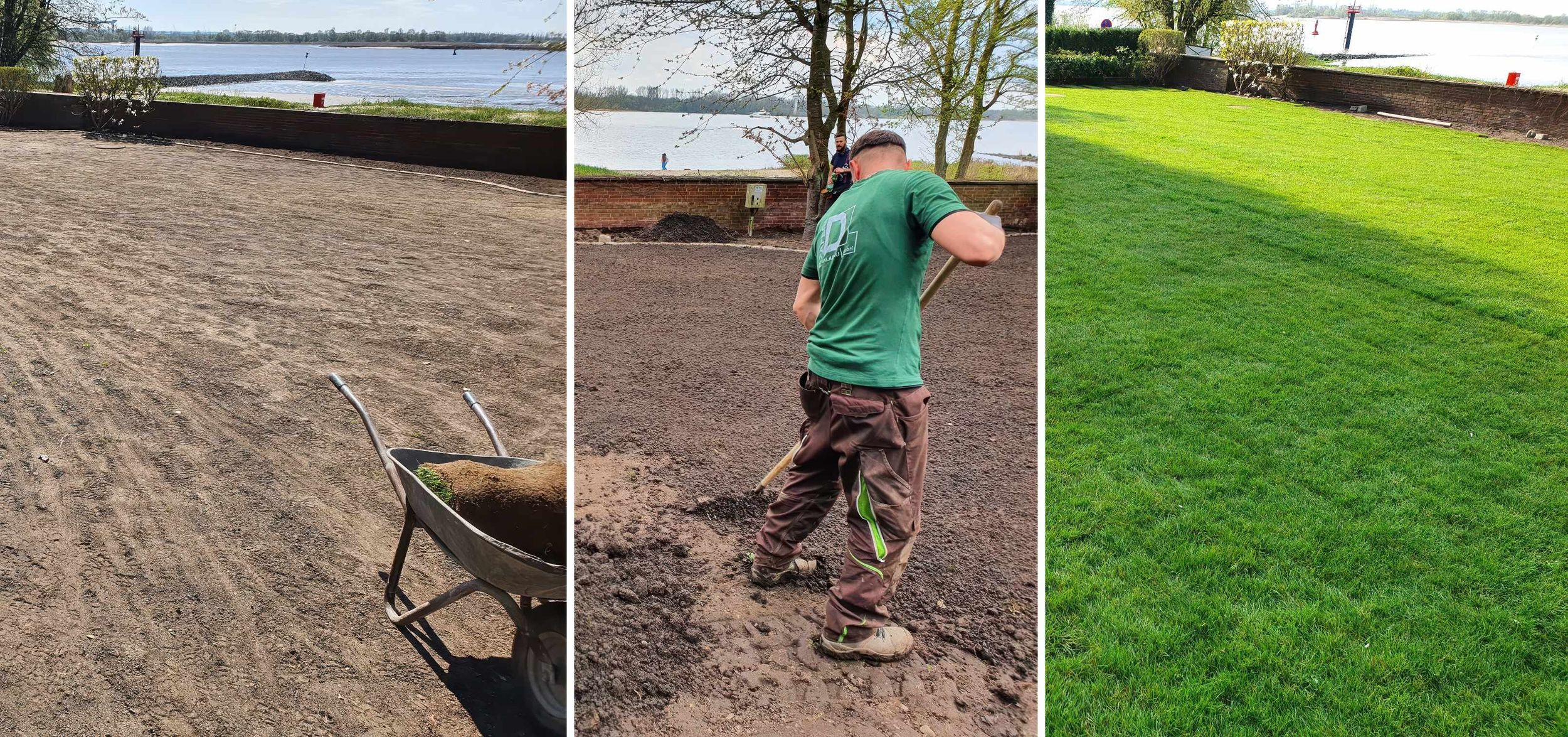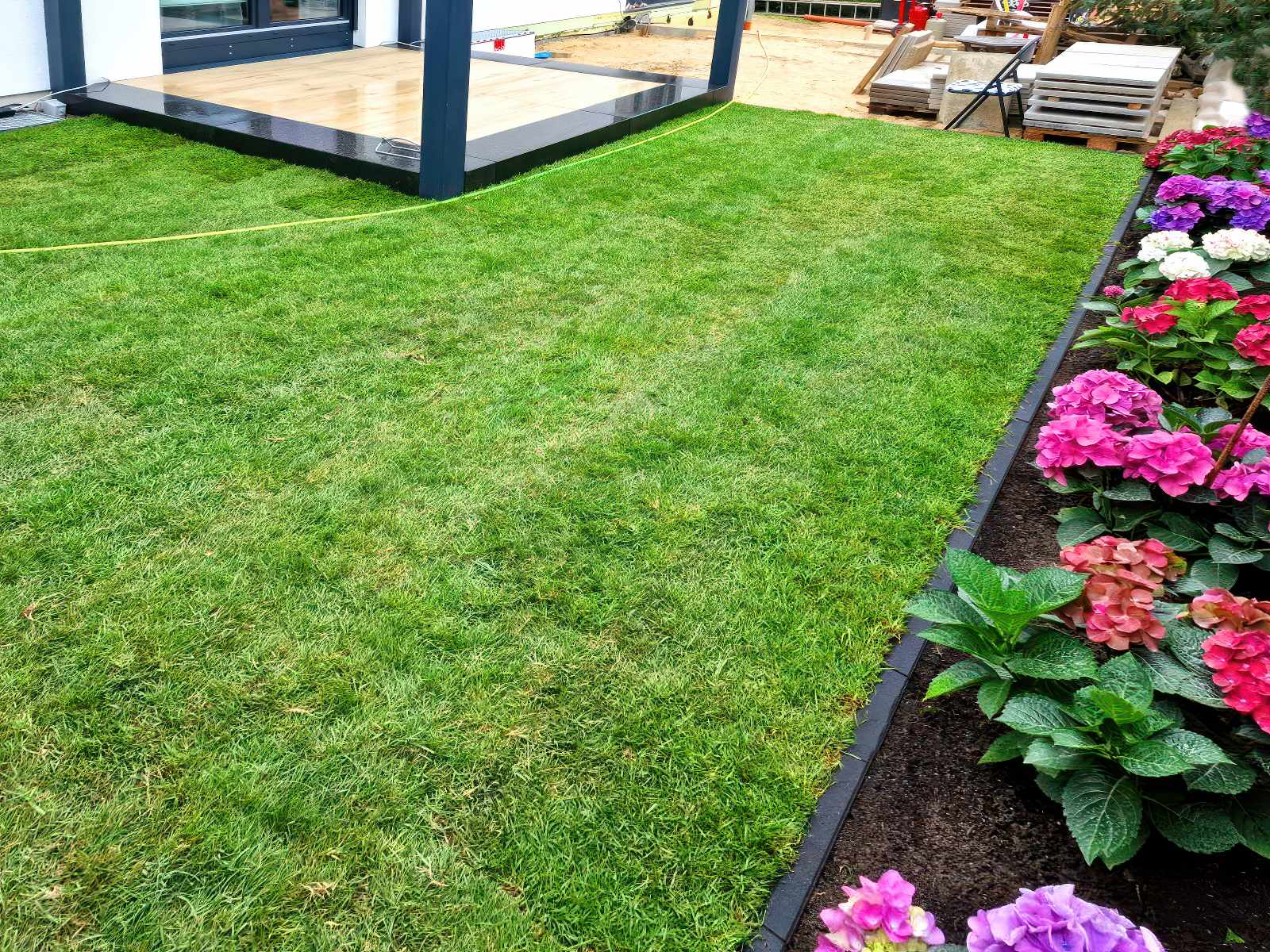 In wenigen Stunden zum frischen Grün! Der alte Rasen wurde abgeschält, Maulwurfgewebe verlegt und frischer Rollrasen installiert. Binnen Stunden erstrahlt der Garten wieder in sattem Grün – dicht, gesund und einladend.