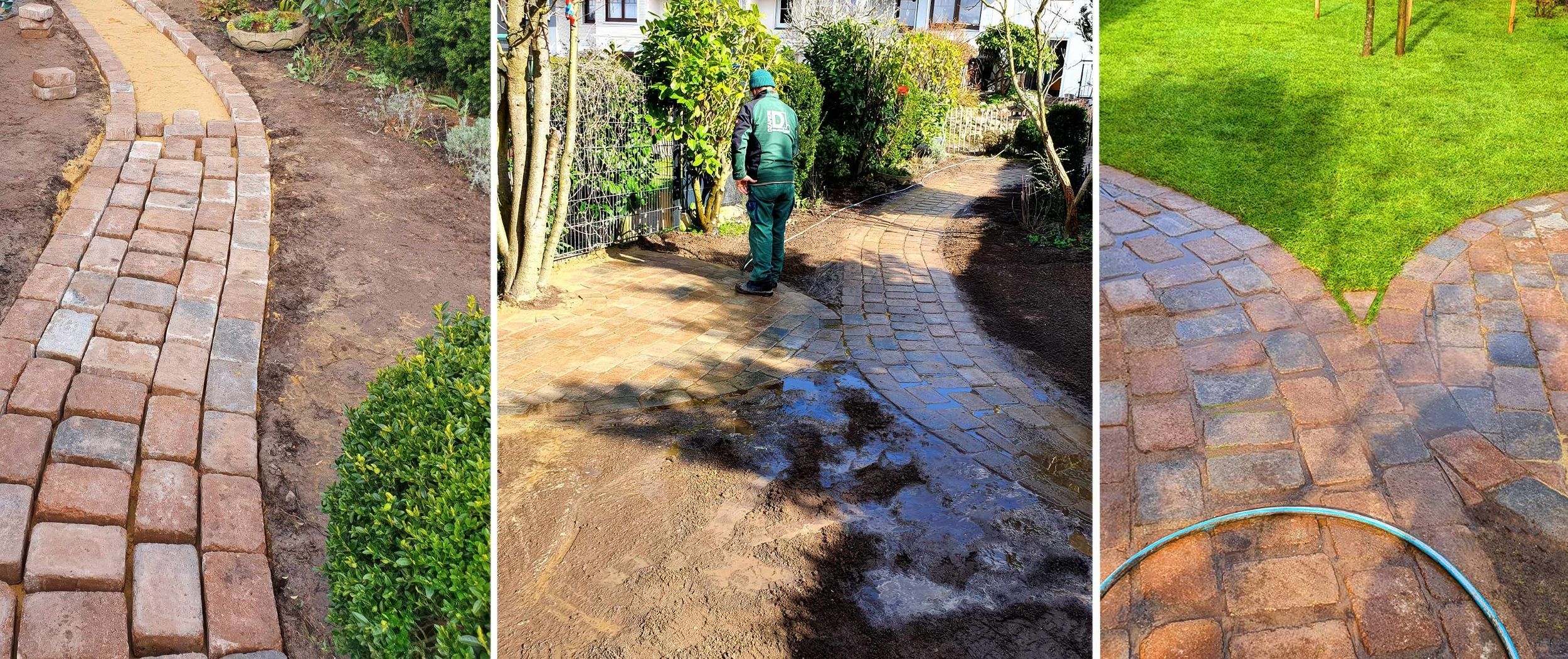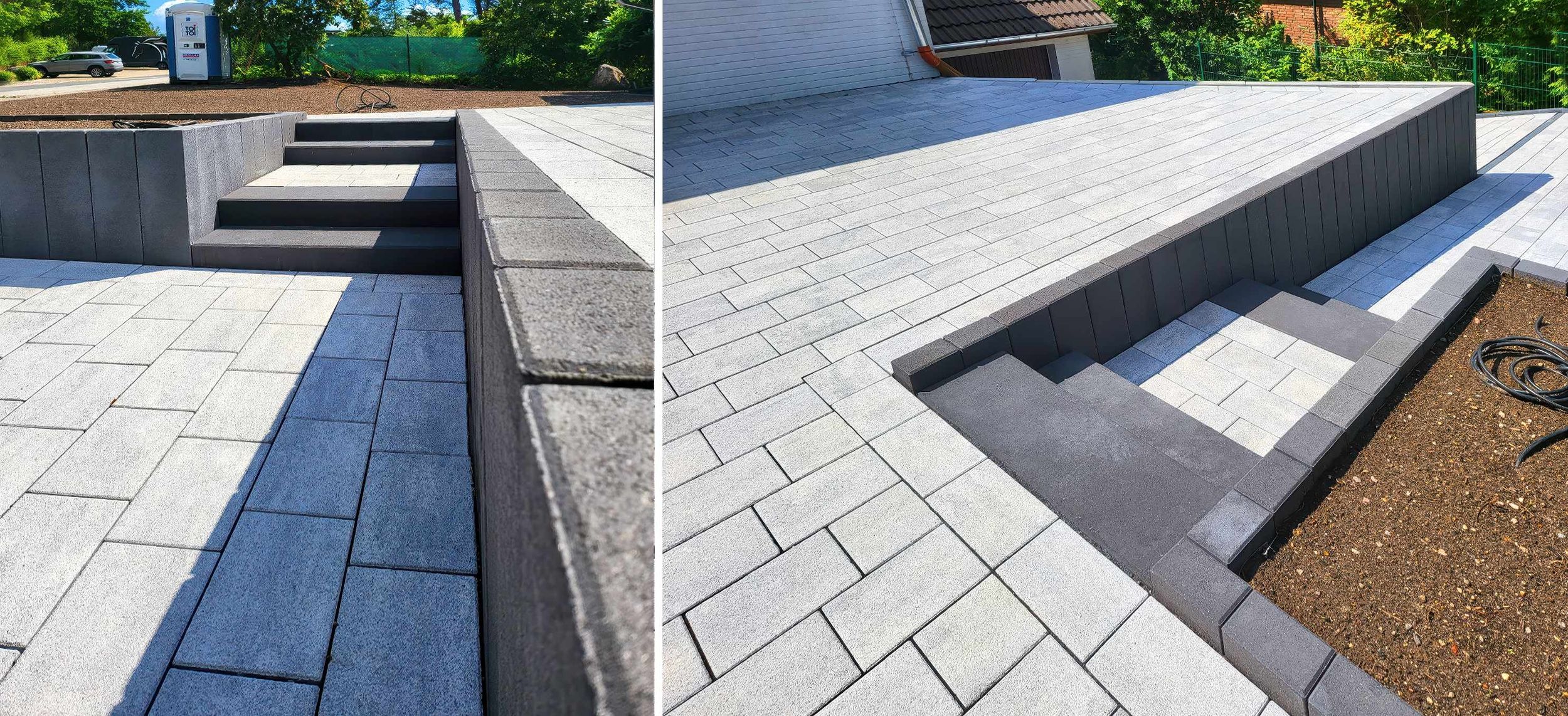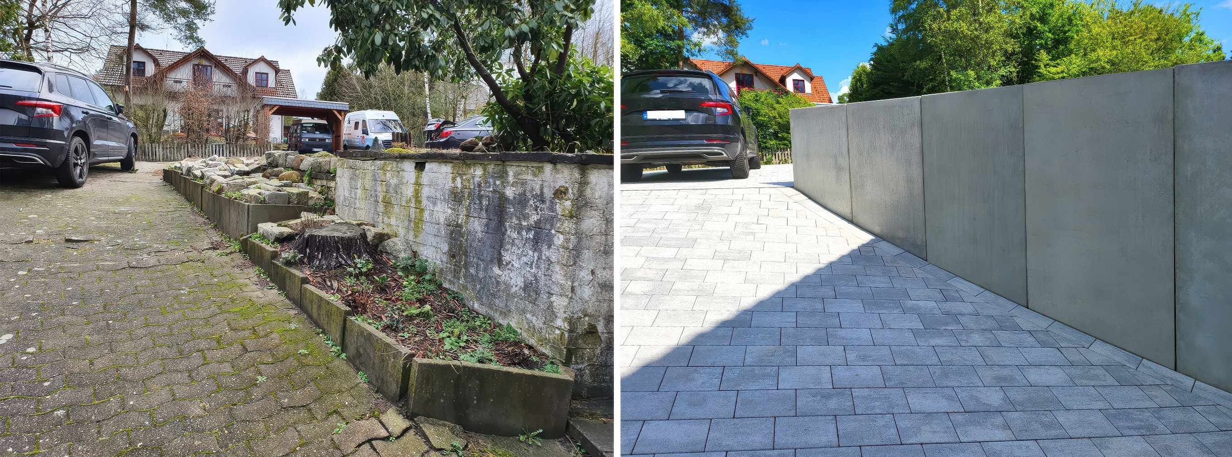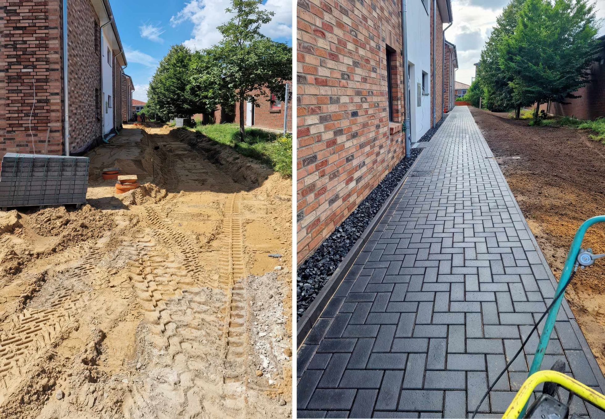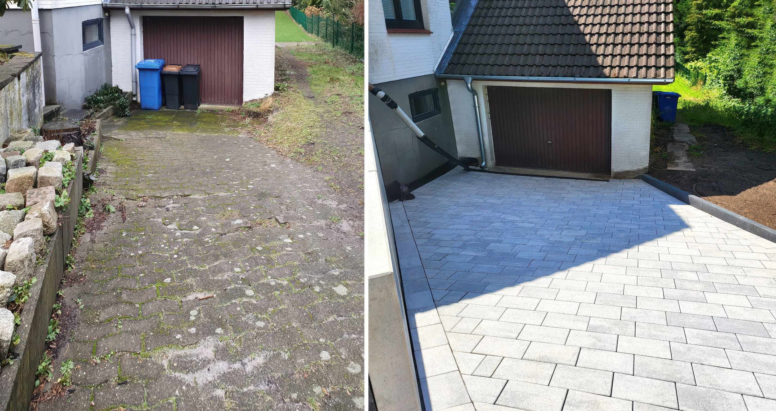 In nur fünf Wochen entstand eine vollständig neue Außenanlage. Um der Familie einen direkten, kurzen Weg vom Stellplatz zum Hauseingang zu ermöglichen, wurde eine neue Stufenanlage geschaffen. Ein integriertes Hochbeet trennt Zuwegung und Stellplatzbereich, lockert die Fläche gestalterisch auf und wird später bepflanzt, sodass zwischen den Pflastersteinen eine grüne, lebendige Oase entsteht. Das Ergebnis: eine funktionale, strukturierte und zugleich natürlich gestaltete Außenanlage in kurzer Bauzeit.