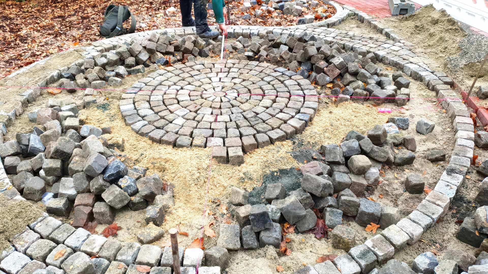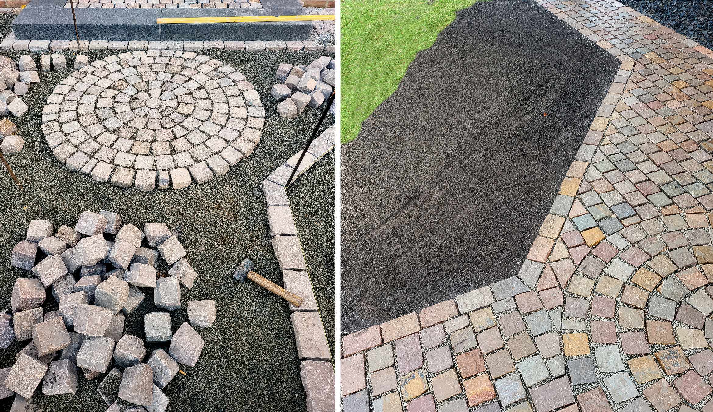 Stein für Stein zum Kunstwerk! Neben der bestehenden Zuwegung entsteht ein rundes Granitrondell – sorgfältig abgesteckt, jeder Stein einzeln ausgewählt und gesetzt. Eine handwerkliche Meisterleistung, die Präzision und Kreativität vereint.