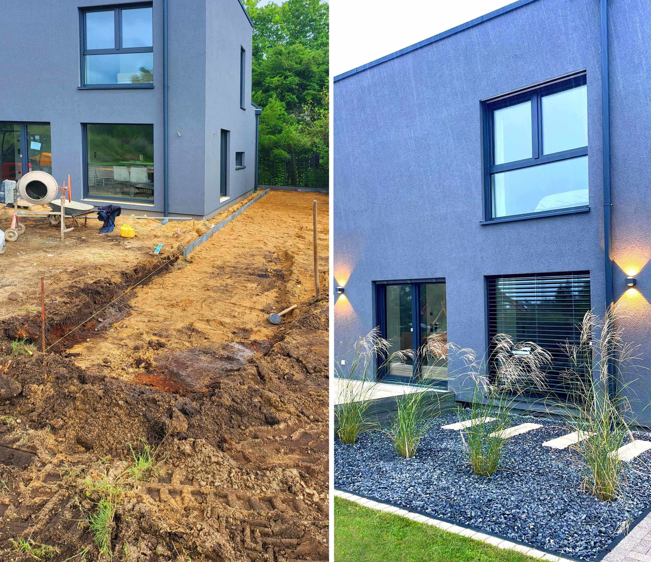 In fünf Wochen verwandelt sich der komplette Vorgarten von einer alten in eine moderne, einladende Anlage. Das Ergebnis kann sich sehen lassen – frisch, strukturiert und stilvoll.