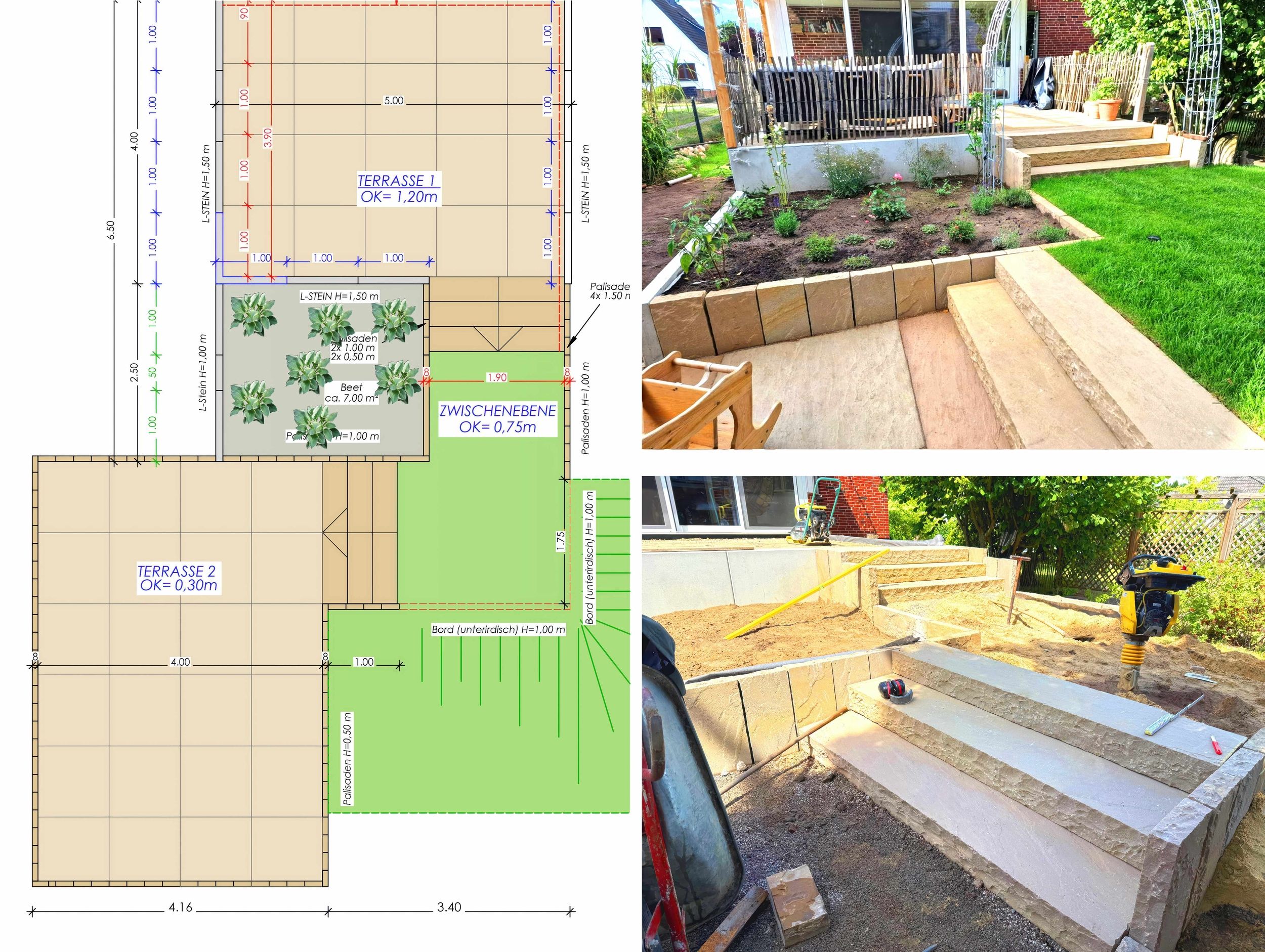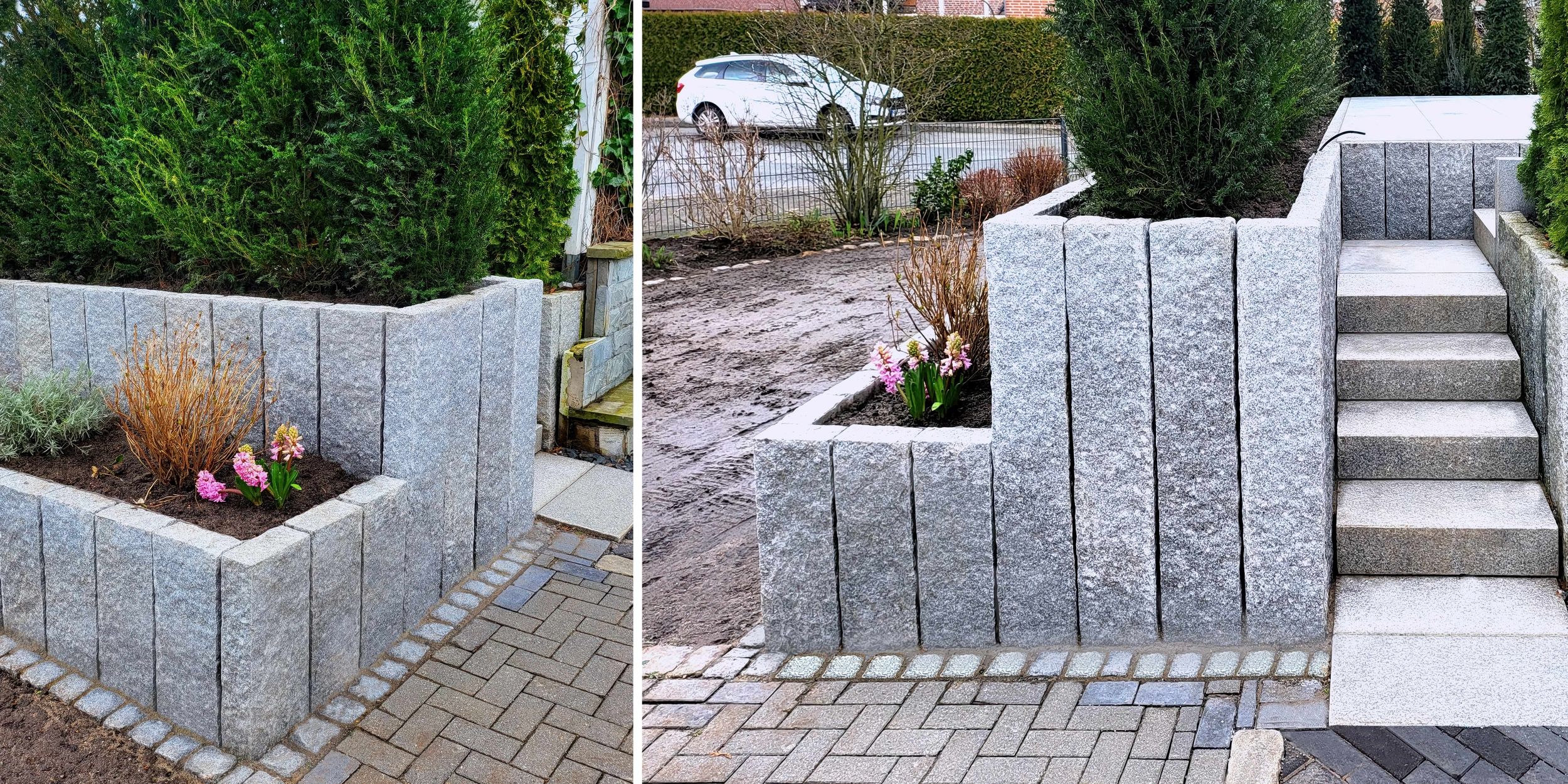 Höhenunterschiede mit Stil und Funktion gelöst. Eine Natursteinanlage aus Granit formt abgetreppte Beete, Stufen und Terrasse. Die obere Terrasse liegt auf Wohnzimmerniveau, darunter entstehen grüne Zonen mit Sichtschutzhecke und bepflanztem Beet. So entsteht ein lebendiger Gartenraum, der Ästhetik und ökologischen Nutzen vereint.
