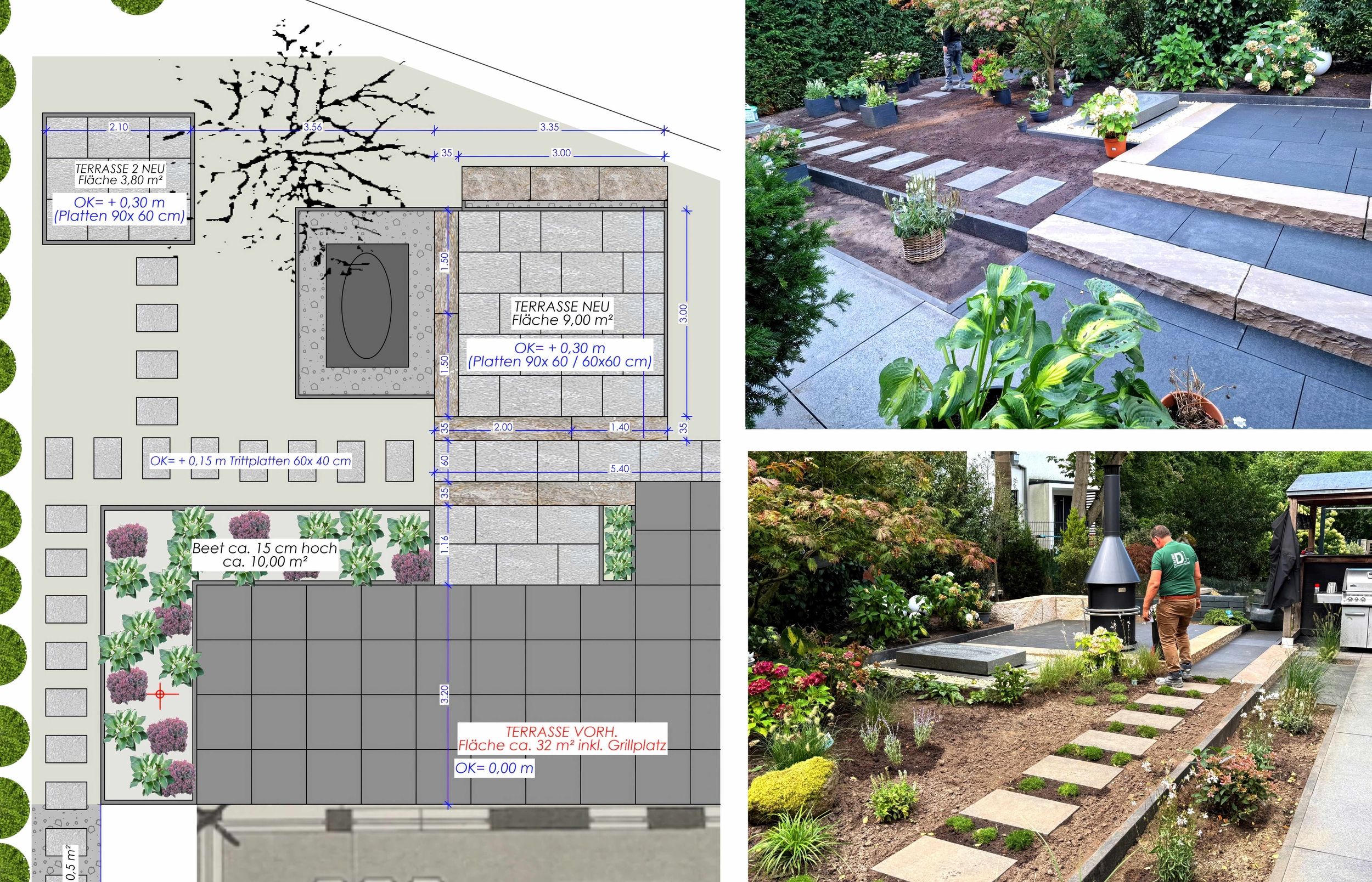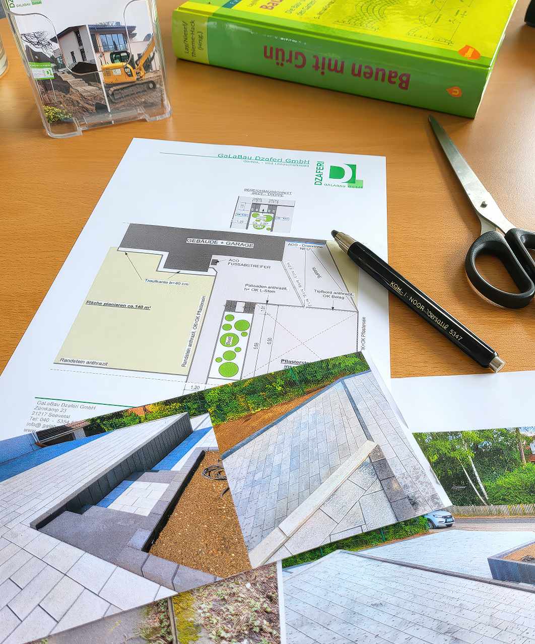 Jede Außenanlage beginnt mit einer Idee – und einem präzisen Plan. Nach dem ersten Vor-Ort-Termin entstehen im Büro die ersten Entwürfe. Am CAD-Programm nimmt der neue Garten Gestalt an. Nach Rücksprache und Optimierung mit den Bauherren wird der fertige Plan an das Baustellenteam übergeben. Mit klarer Planung, gutem Wetter und Teamarbeit entsteht innerhalb weniger Wochen eine neue, perfekt abgestimmte Außenanlage!