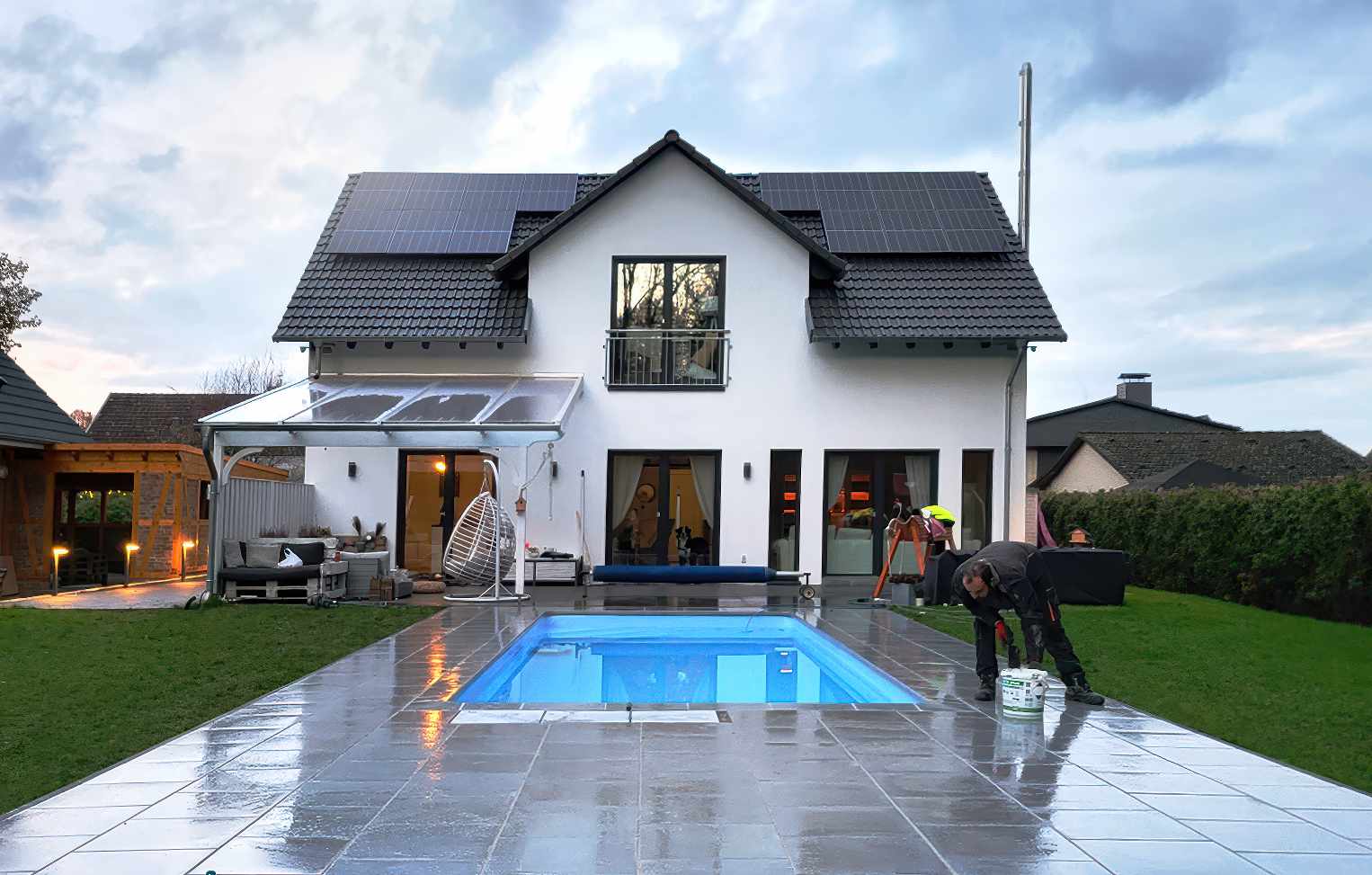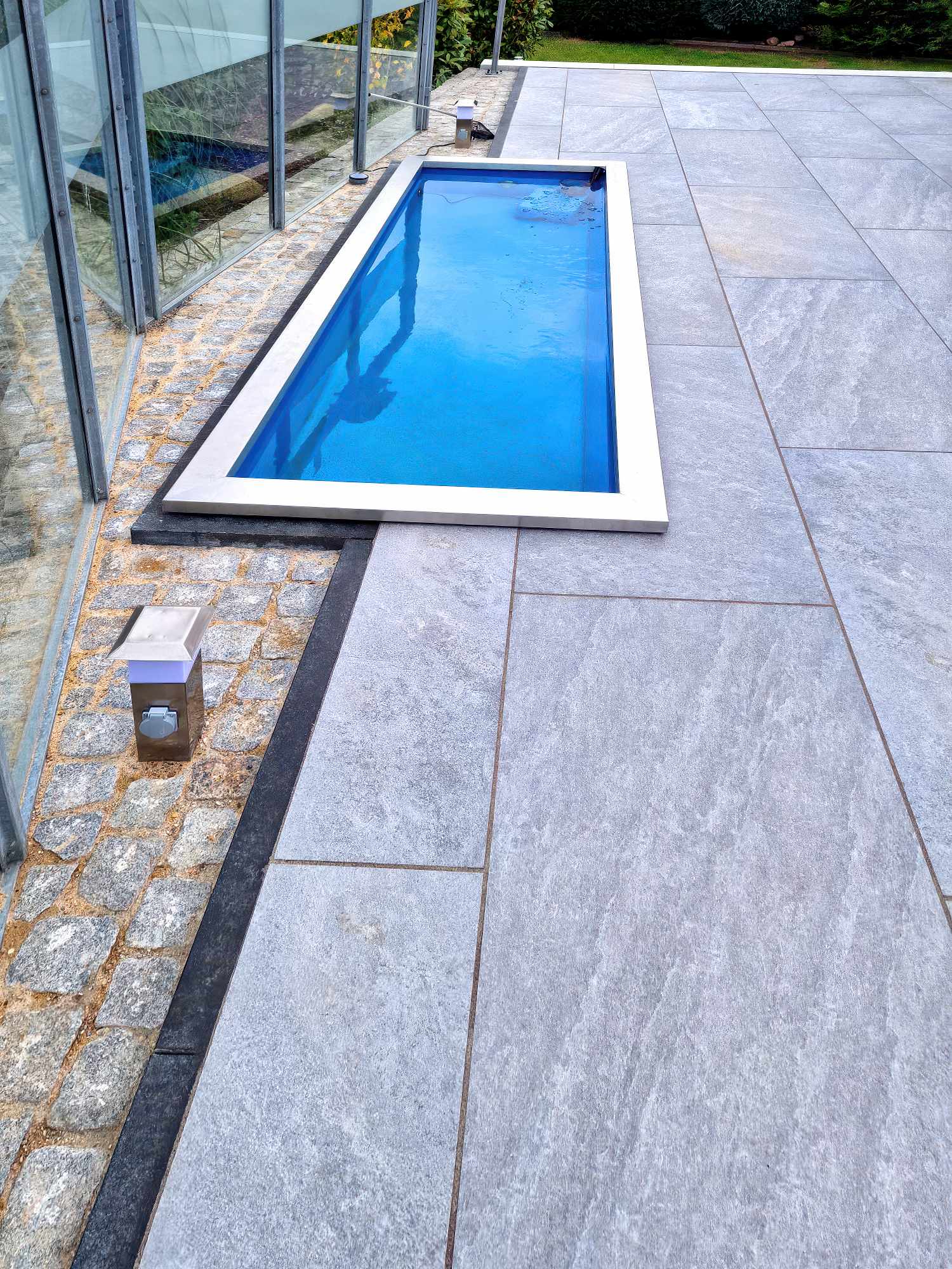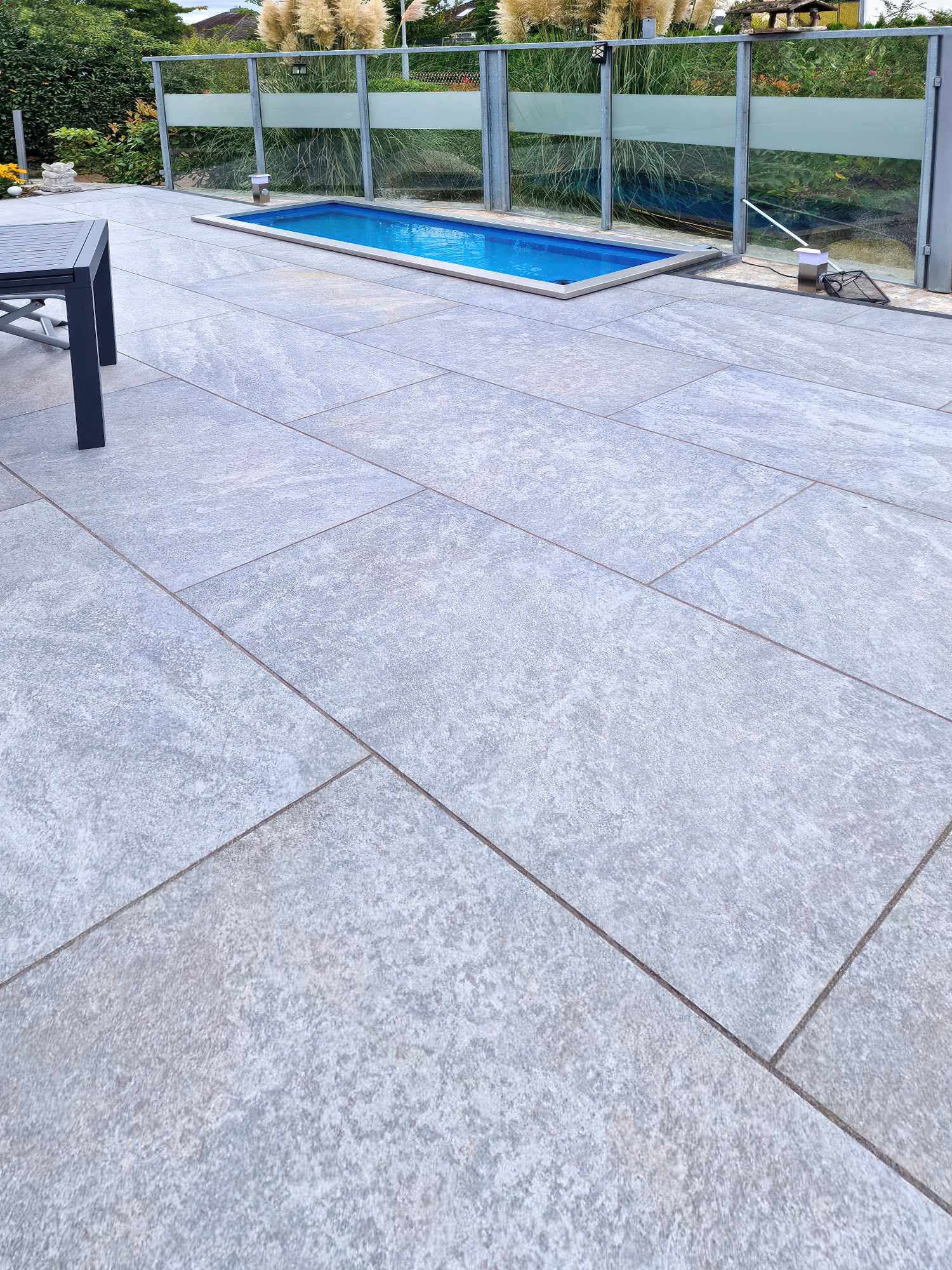 Urlaub im eigenen Garten – jeden Tag Sommerfeeling! Rund um den Pool wurde die Terrasse komplett neu angelegt und sorgfältig verfugt. Das Ergebnis ist ein harmonischer, pflegeleichter Bereich, der Erholung und Familienzeit verbindet. Hier entsteht echtes Urlaubsgefühl – ganz ohne zu verreisen.