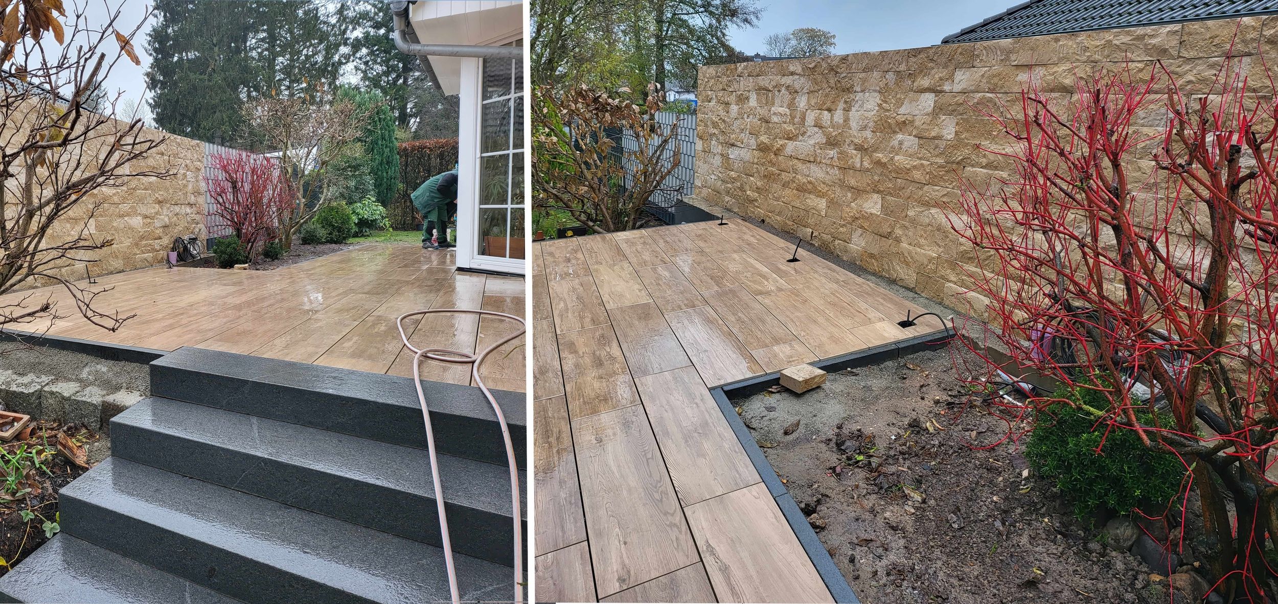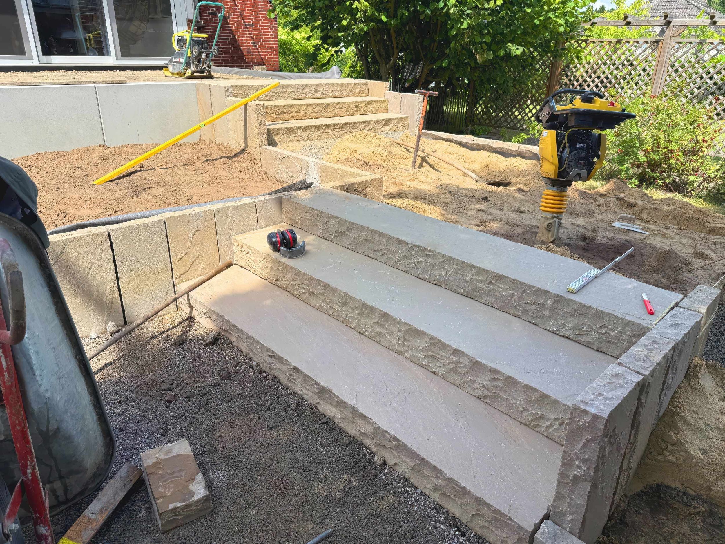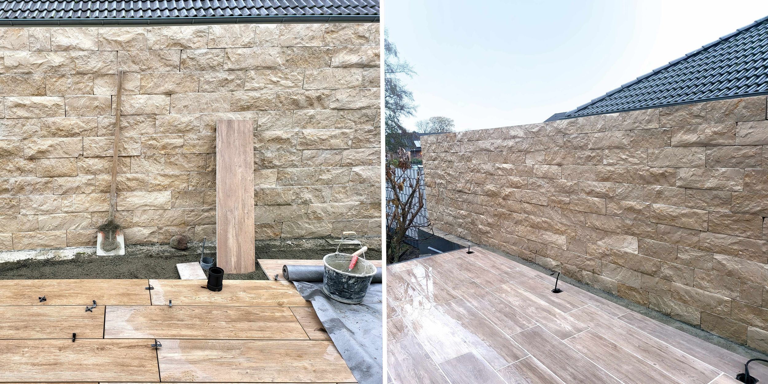 Drei Wochen bis zur fertigen Natursteinanlage! Eine Kombination aus Sandsteinmauer, Keramikplatten und Natursteinblockstufen wurde innerhalb von drei Wochen umgesetzt. Nach der präzisen Verfugung entstand eine harmonische, langlebige Außenanlage mit natürlicher Ausstrahlung.
