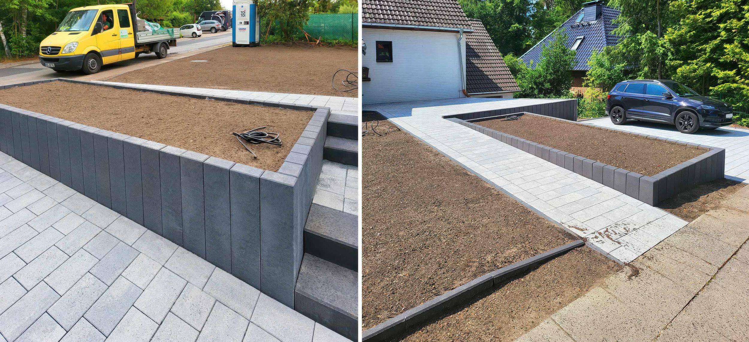 In nur fünf Wochen entsteht eine komplett neue Außenanlage: Vorgarten mit Palisaden und integriertem Hochbeet, gepflasterte Fläche, Zufahrt, Tiefgaragenzufahrt und Zuwegung – alles aus einem Guss.