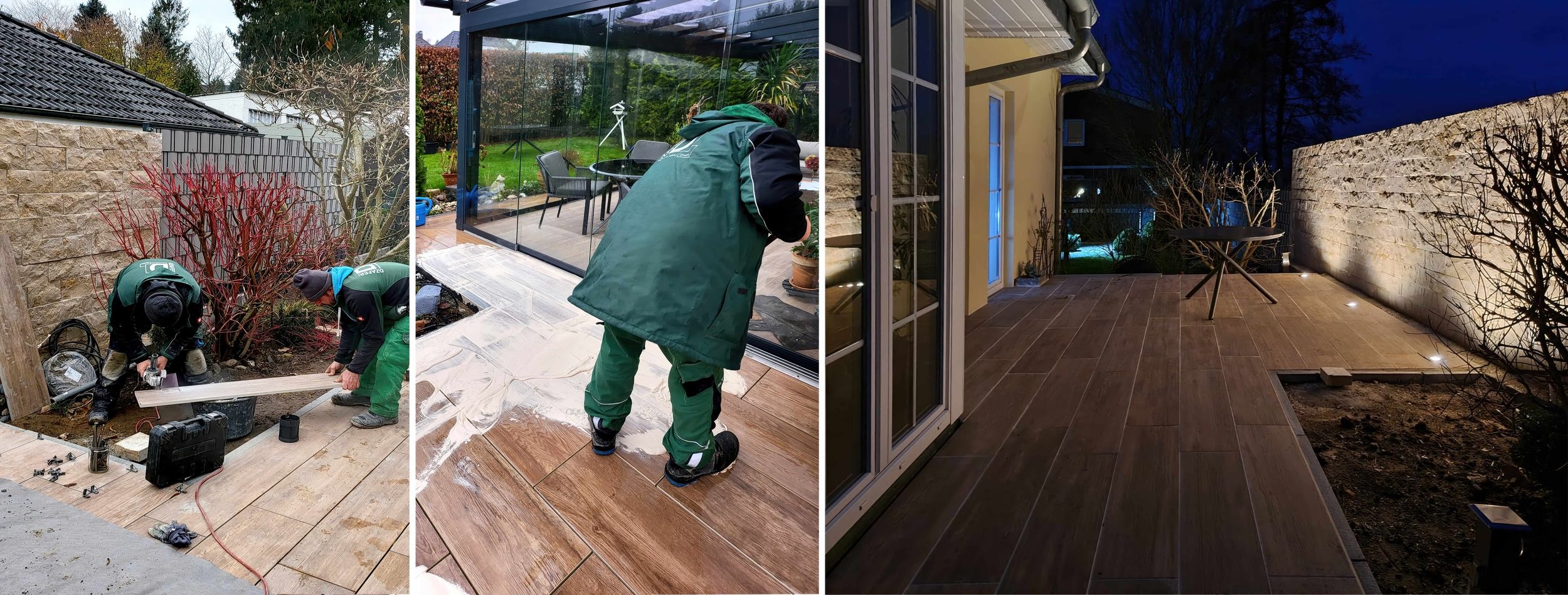 Sandstein, Licht und Holzoptik – stilvoll kombiniert! Eine Sandsteinmauer mit integrierter Beleuchtung bildet den neuen Sichtschutz. Die angrenzende Terrasse aus Keramikplatten in Holzoptik wirkt warm und wohnlich. Sie erweitert das Wohnzimmer ins Freie und bietet gemütliche Stunden – bei Tag und Nacht.