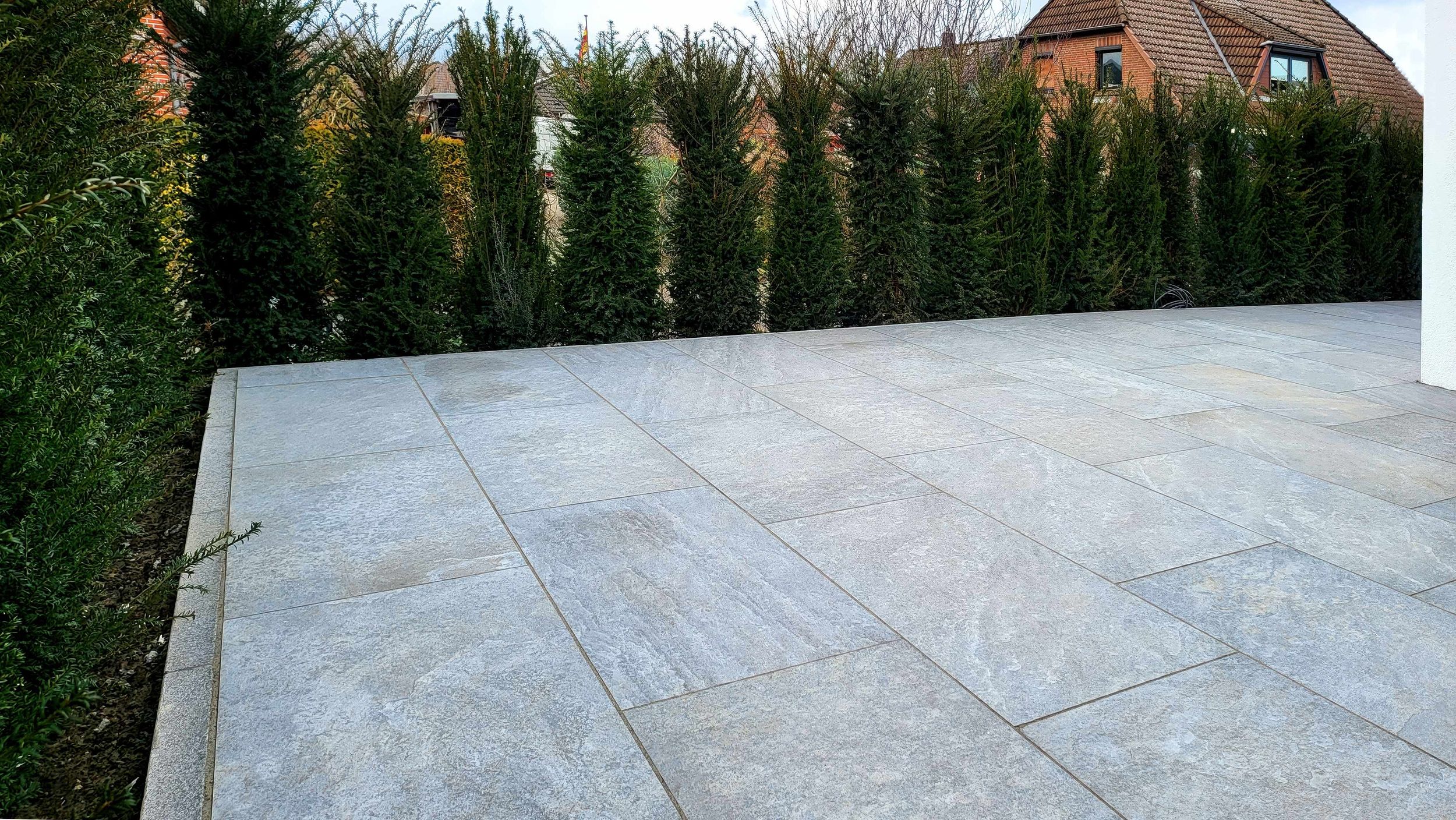 Terrassenfläche auf hohen Ebene – funktional und stilvoll. Die Terrasse und angrenzenden Beete liegen höher als die Rasenfläche und wurden mit Natursteinstelen eingefasst. Neue Eibenpflanzen sorgen als grüner Sichtschutz für Privatsphäre. Die Keramikplatten verleihen der Terrasse ein modernes, gepflegtes Erscheinungsbild.