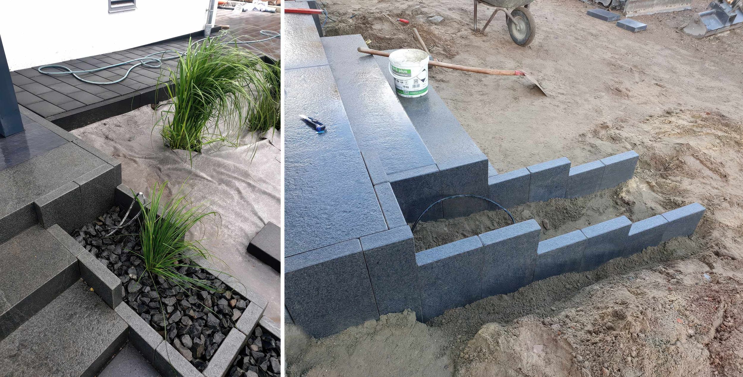 In 5 Wochen zur neuen Außenanlage! Beim Neubau fiel die Wahl auf Granitblockstufen Mavero Black und Wienerberger-Pflaster – ganz nach Wunsch der Bauherren. Hier sieht man eindrucksvoll, wie präzise eine Stufenanlage wächst und Form annimmt – von der ersten Lage bis zur fertigen Anlage.