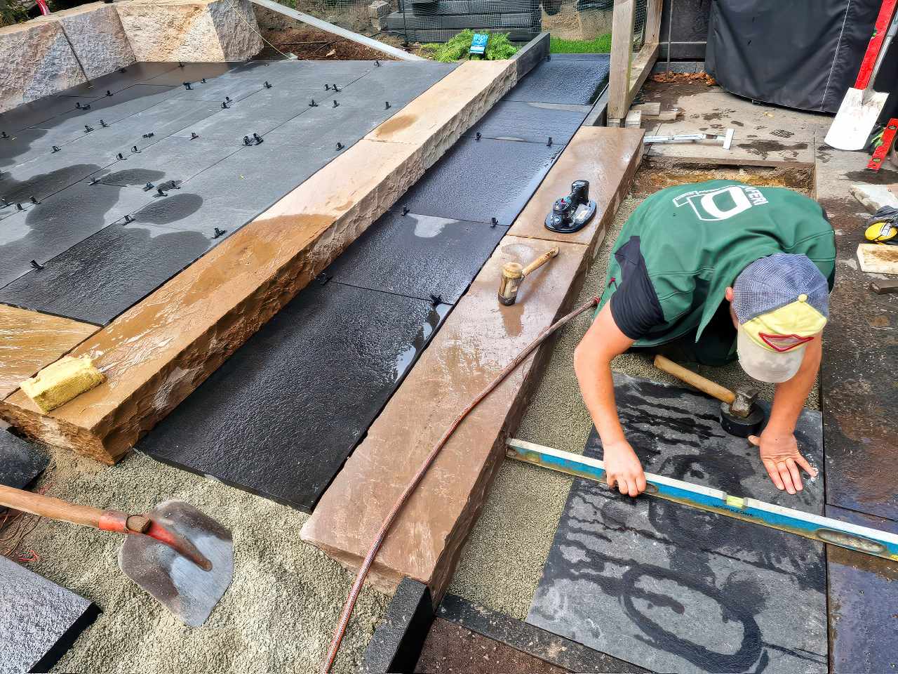 Präzise Arbeit bis zum letzten Schritt. Eine aufwendig hergestellte Terrassenanlage wird nach drei Wochen Bauzeit final verfugt. Das Ergebnis: eine langlebige, saubere Fläche mit exakter Linienführung und hoher handwerklicher Qualität.