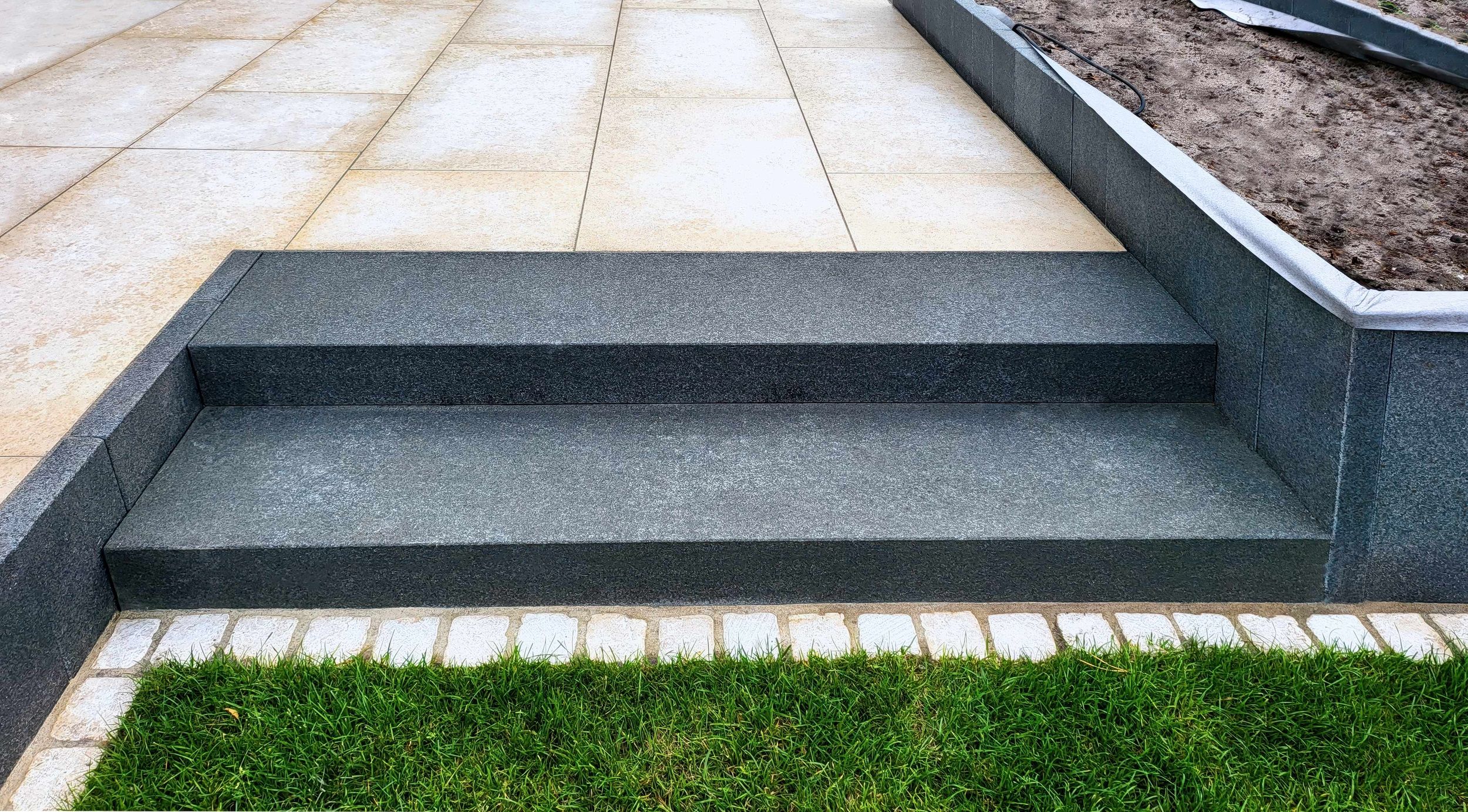 Kontrastreiche Stufen- und Terrassenanlage. Eine elegante Naturstein-Terrassenanlage mit Stufen, inspiriert vom Bauhaus-Stil. Klare Linien, starke Kontraste und hochwertige Materialien schaffen ein markantes, zeitloses Gesamtbild.