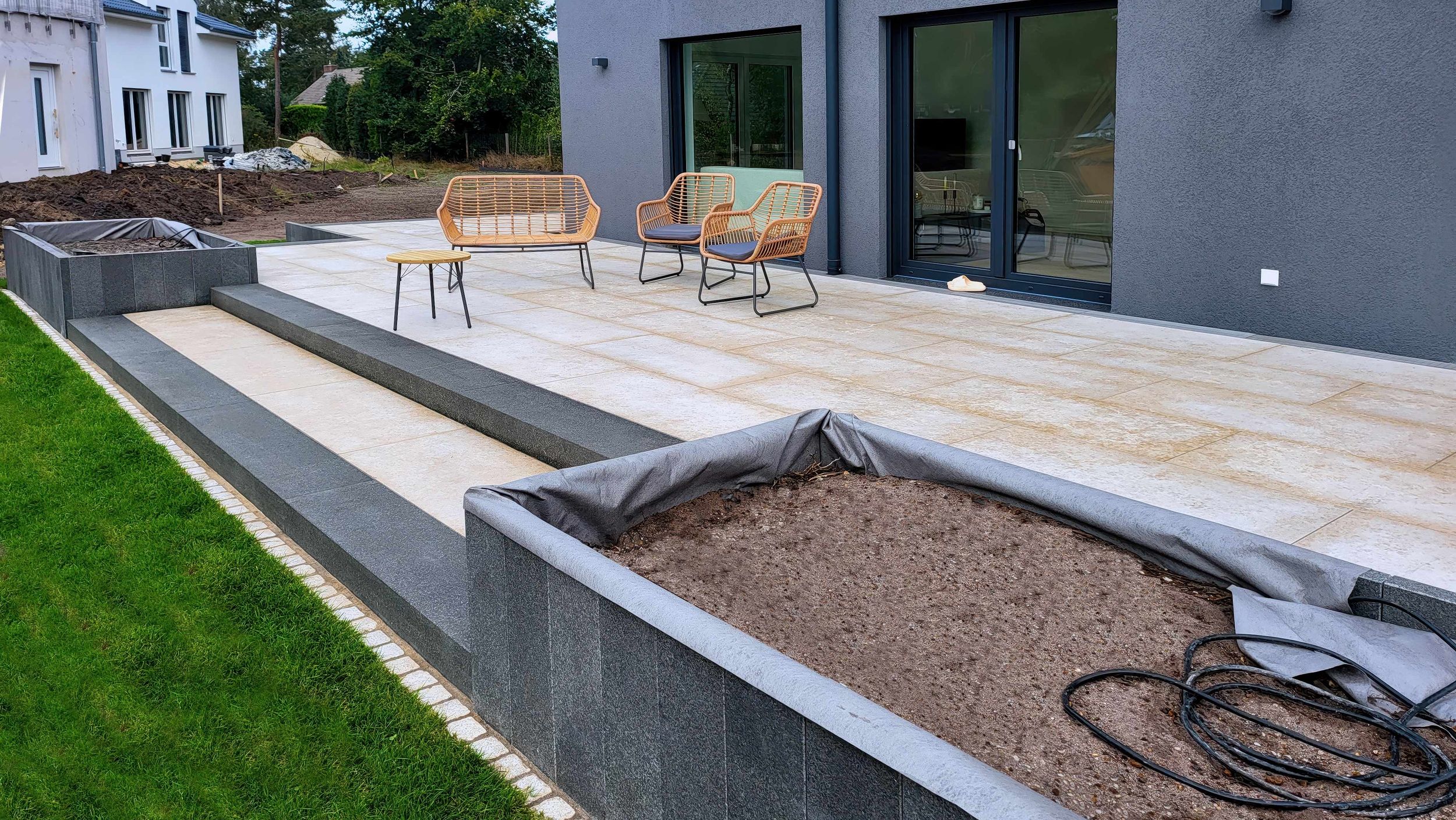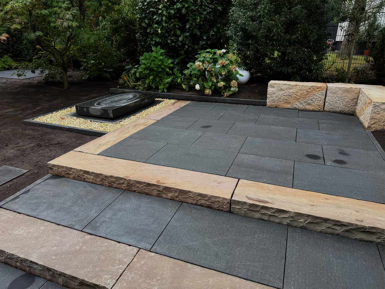 Das Ziel: die unterschiedlichen Höhen des Bestandshauses harmonisch zu verbinden. Entstanden ist eine großzügige Außenanlage als natürliche Verlängerung des Wohnzimmers – perfekt für Familie. Verarbeitet wurden Sandsteinplatten in Kingsize-Format und Sandsteinblockstufen.