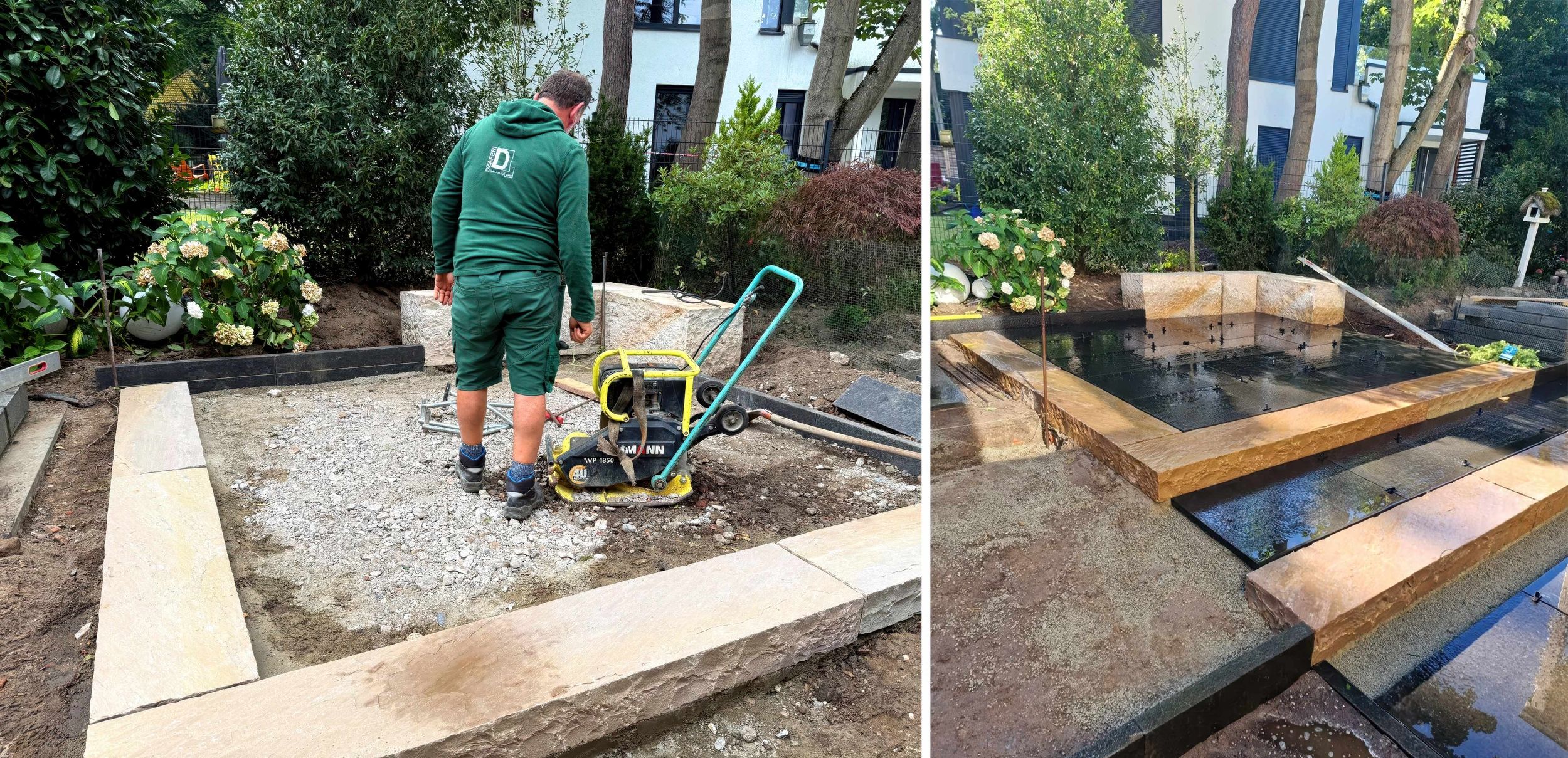 Engagement, Präzision und persönlicher Einsatz. Die Terrasse und Sandsteinmauer wurden innerhalb von drei Wochen umgesetzt und verfugt. Das Team von Galabau Dzaferi arbeitet mit höchster Präzision – unter der Leitung von Herrn Dzaferi persönlich. Keine Fuge bleibt unkontrolliert. Integrierte Beleuchtung sorgt abends für ein stimmungsvolles Ambiente und unterstreicht die handwerkliche Qualität!