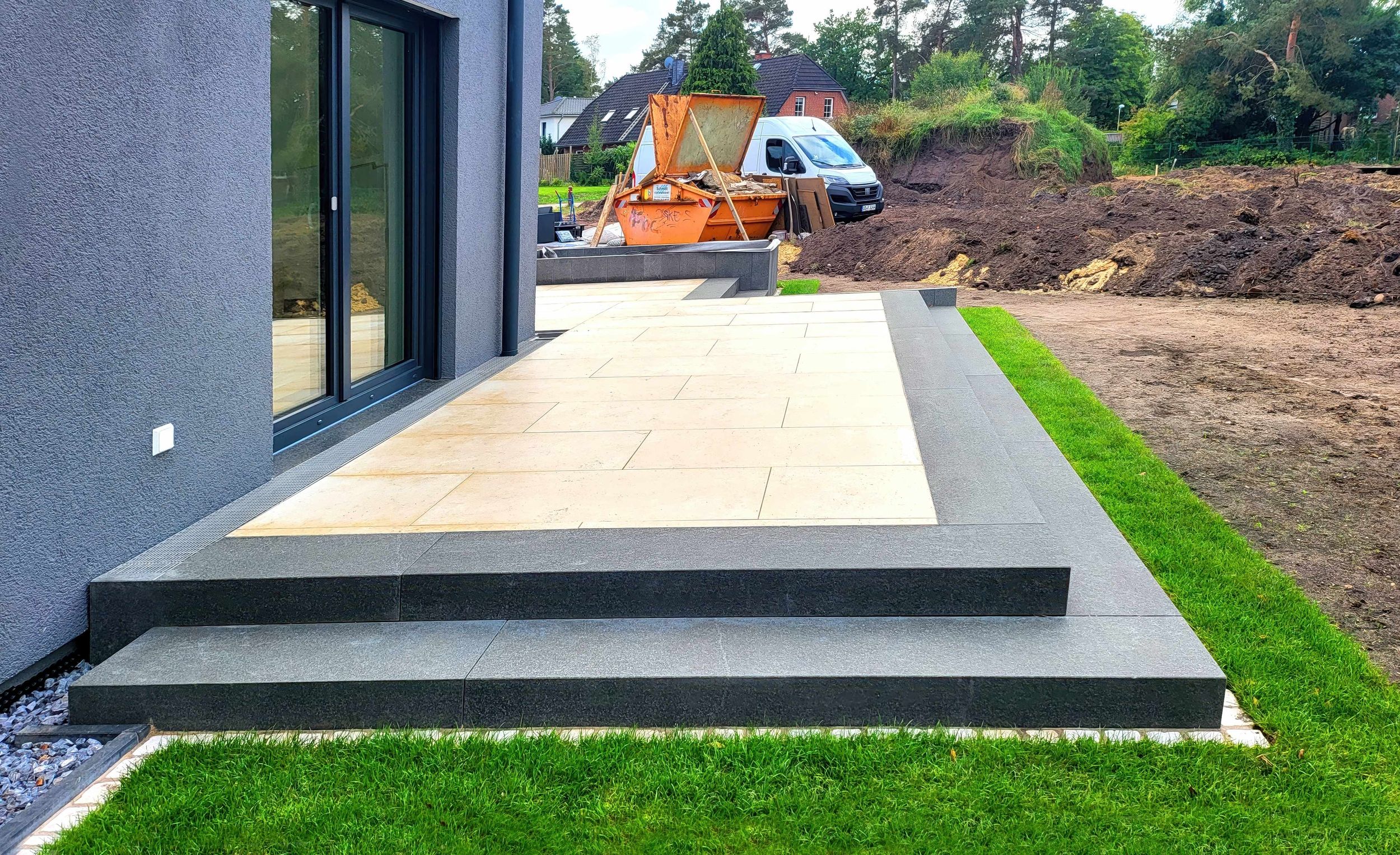 Moderne Reduktion, klare Formen und perfekte Ausführung! Beim Neubauprojekt in Maschen stand Geradlinigkeit, Kontrast und Präzision im Mittelpunkt. Eine weitläufige Terrasse aus hellem Kanfanar-Naturstein und dunklem Maveiro Black wurde kombiniert mit einer Mähkante aus Kanfanar-Pflaster und frischem Rollrasen. Integrierte Hochbeete lockern die Fläche auf und fügen sich harmonisch ins Gesamtkonzept ein. Von der ersten Baggerschaufel bis zur Fertigstellung vergingen nur fünf Wochen.
