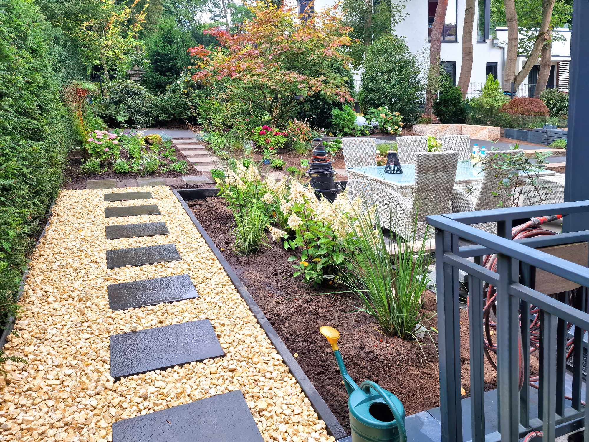 Ein Garten ganz ohne Rasen: Nach dem Abschälen der alten Fläche entstehen mehrere Bereiche – zwei Terrassen (eine für gemütliche Abende, eine zum Lesen und Entspannen), ein Kiesbereich mit Trittplatten und begrünte Beete. Das Ergebnis ist ein harmonischer, durchdachter und natürlicher Gartenraum.