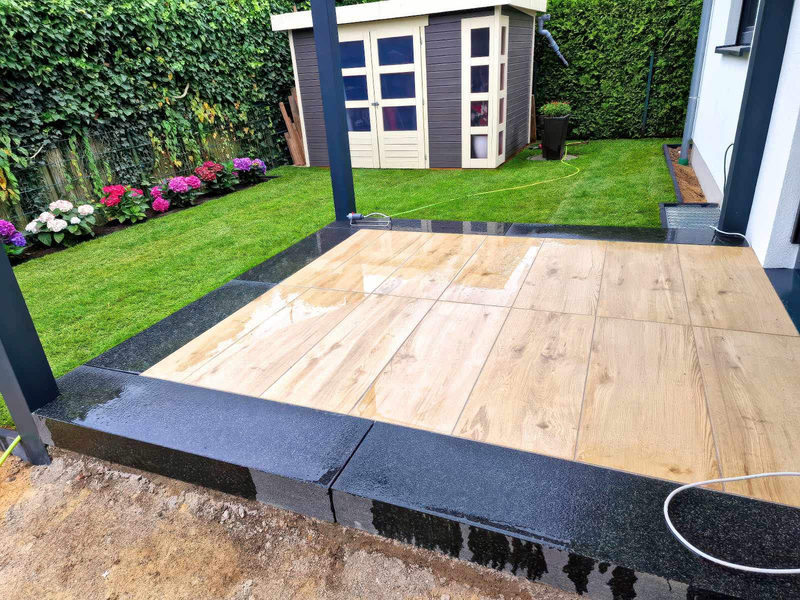 In nur zwei Wochen entsteht ein elegantes Eingangspodest mit Terrasse aus Granitblockstufen und Keramikplatten. Dazu kommt Rollrasen, Draufkante und Beeteinfassung – alles präzise umgesetzt bis ins Detail.